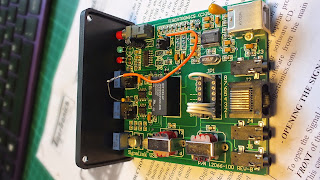 I have also removed the 1K resistor feeding the audio circuitry power and fed the supply via 470R and the orange jumper wire you can see. This takes the power from the PIC regulator rather than the dirty USB supply. I have also added 47uF tantalum capacitor to the USB power supply: