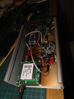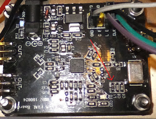so that there is no power to the on-board 25MHz XO. I'm running mine using the shack 10MHz frequency standard I made back here. This external oscillator input simply connects to the SMA socket on the back of the board.